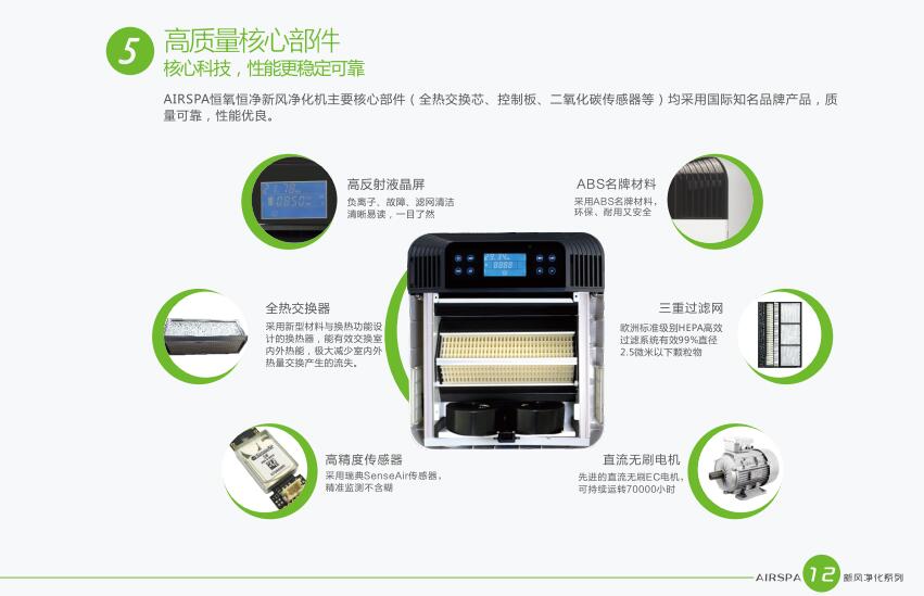 AIRSPA恒氧恒凈新風(fēng)凈化機(jī)主要核心部件(全熱交換芯、控制板、二氧化碳傳感器等)均采用國際知名品牌產(chǎn)品、質(zhì)量可靠、性能優(yōu)良。